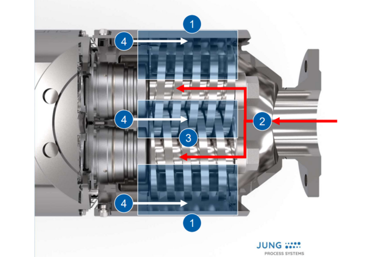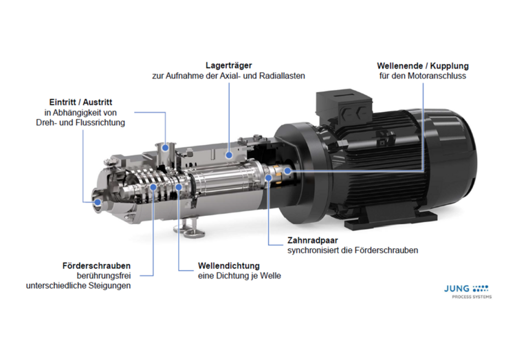 - Verdrängerprinzip: Zwischen den Förderschrauben und dem Pumpengehäuse bilden sich Förderkammern.