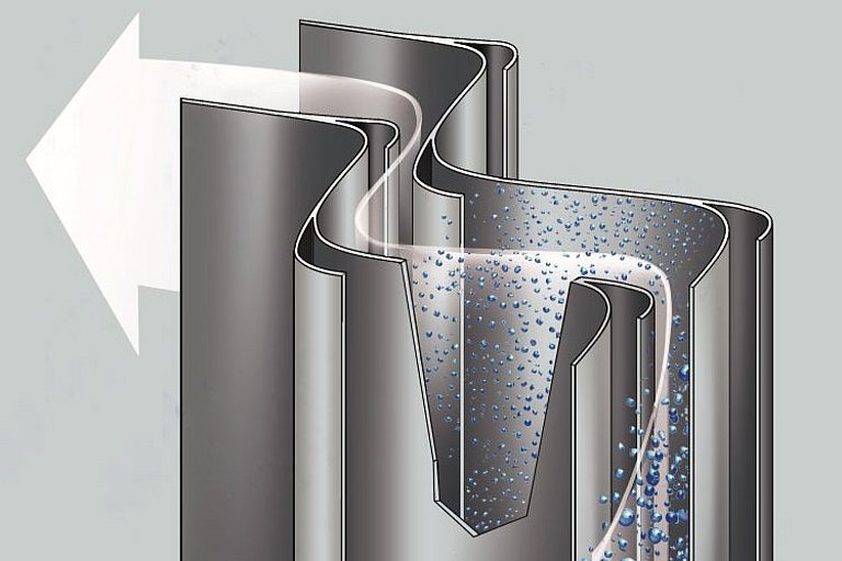 Lechler Tropfenabscheider sind Lamellenabscheider, die nach dem Prinzip der Massenträgheit funktionieren. Der flüssigkeitsbeladene Gasstrom wird durch ein Strömungsgitter aus gebogenen, profilierten Lamellen geleitet. Während der Gasstrom entlang der Lamellen strömt, behalten die mitgeführten Flüssigkeitstropfen aufgrund ihrer Trägheit ihre Flugbahn bei. Die Tropfen kollidieren schließlich mit den Oberflächen der Lamellen und bleiben daran haften, während das gereinigte Gas den Abscheider passiert und weitergeleitet wird. Durch diesen Prozess werden die flüssigen Bestandteile effektiv von dem Gasstrom separiert.